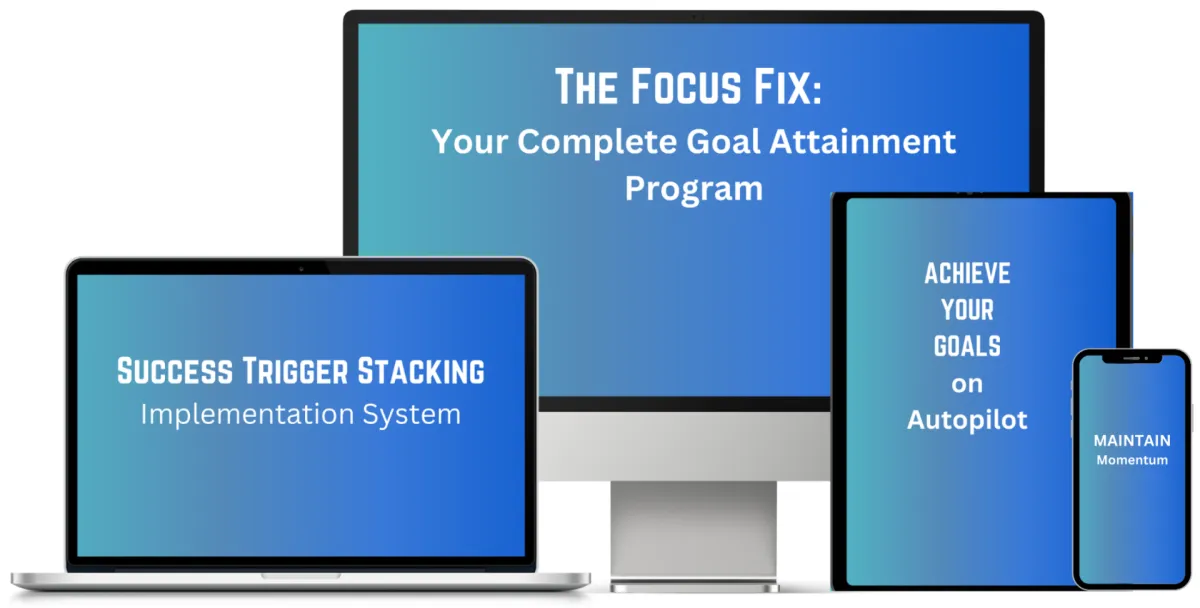 The Focus Fix is a complete goal achievement system built on Success Trigger Stacking - a neurological sequencing system that transforms your brain's natural resistance to focus into an automated success response. The program includes the Success Trigger Stacking implementation system to go from Scattered to Successful.
